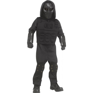 The costume includes a black hooded jumpsuit, tactical vest, wrist guards, knee pads, gloves, and a matching mask for a complete and realistic appearance. Designed for comfort and durability, it allows your child to move freely while impressing friends and family.