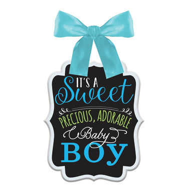 Admire the traditional baby shower sign measuring 14 1/4" x 9 1/4", made of MDF panel and decorated with the slogan "it's a sweet little boy". Perfect for a baby shower and a gender reveal surprise. The discreet size and attractive design make this sign perfect for successful wall decoration.