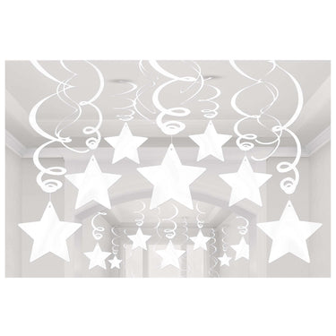 This set of 30 white star shaped hanging decorations. Each decoration is swirled to add a touch of movement to your decor.