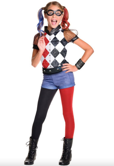 Get the iconic Harley Quinn look with this Deluxe child costume! With a vibrantly colored top, shorts with attached leggings, an eye mask, a bracelet, and a belt, your child will transform into a legendary supervillain in no time! So don't wait any longer and order this costume for a unique and memorable look!