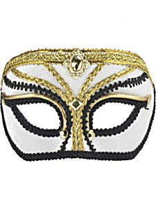 Le Masque Oriental Blanc, Or et Noir est un masque venitien luxueux et sophistiqué. Sa texture légère et ses couleurs vives s'accommodent parfaitement avec une variété de tenues.